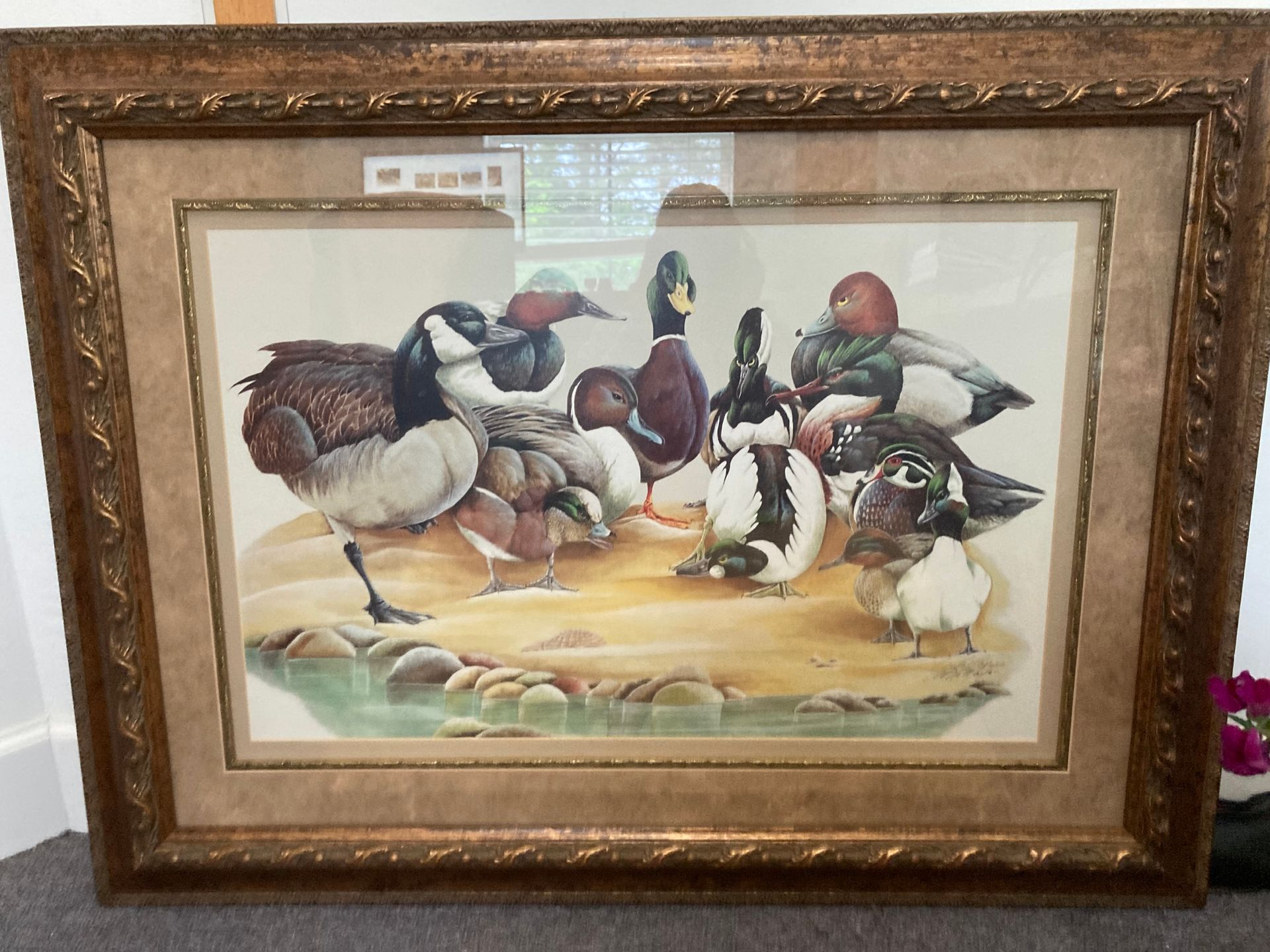 Beautifully framed print of ducks on shore. Print number 30/950, signed by the artist, Art La May.