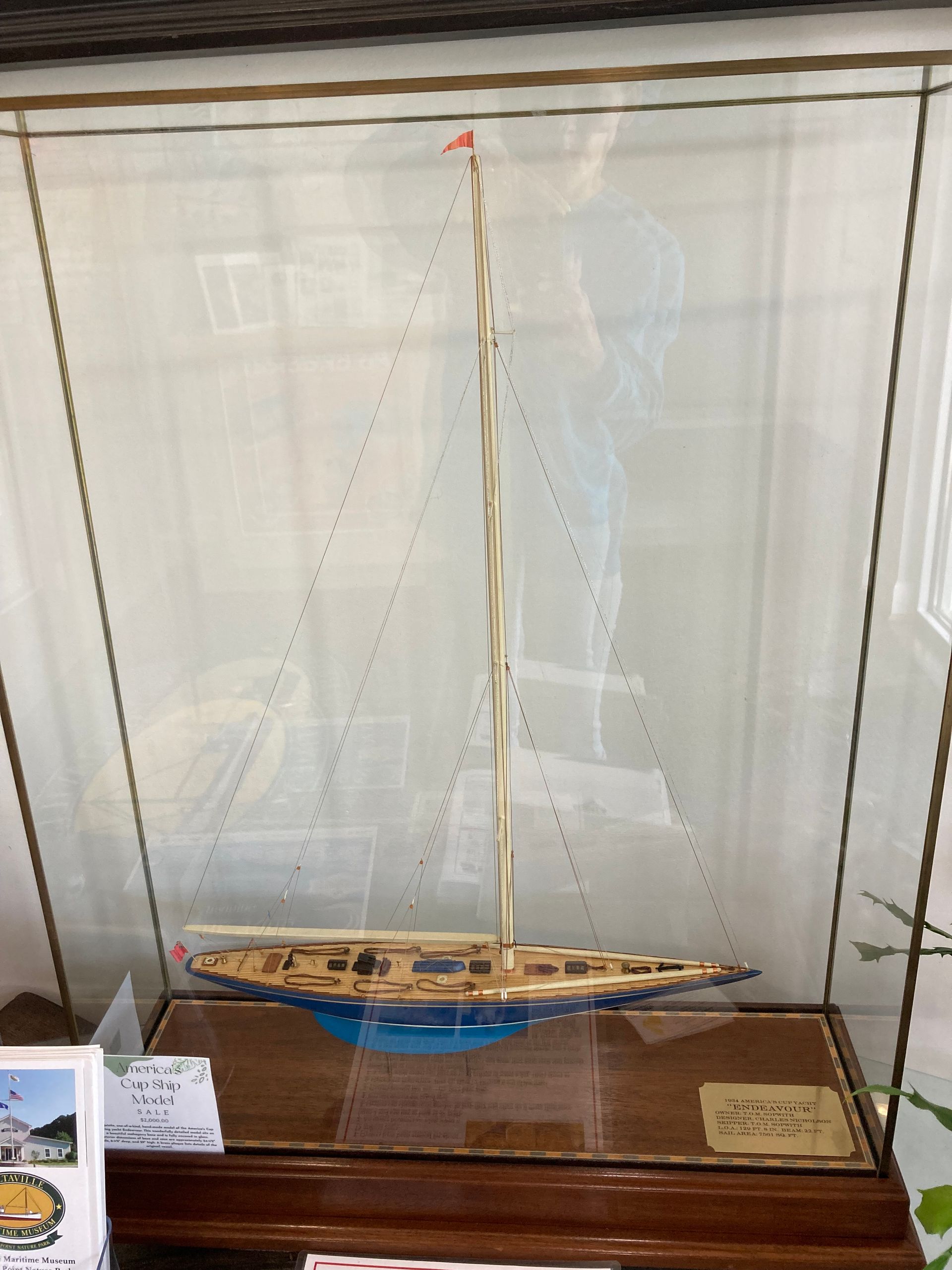 Exquisite, one-of-a-kind, hand-made model of the America's Cup racing yacht Endeavour. This wonderfully detailed model sits on a beautiful mahogany base and is fully encased in glass. Exterior dimensions of base and case are approximately 24-1/2" wide, 6-1/2" deep, and 29" high. A brass plaque lists details of the original vessel.