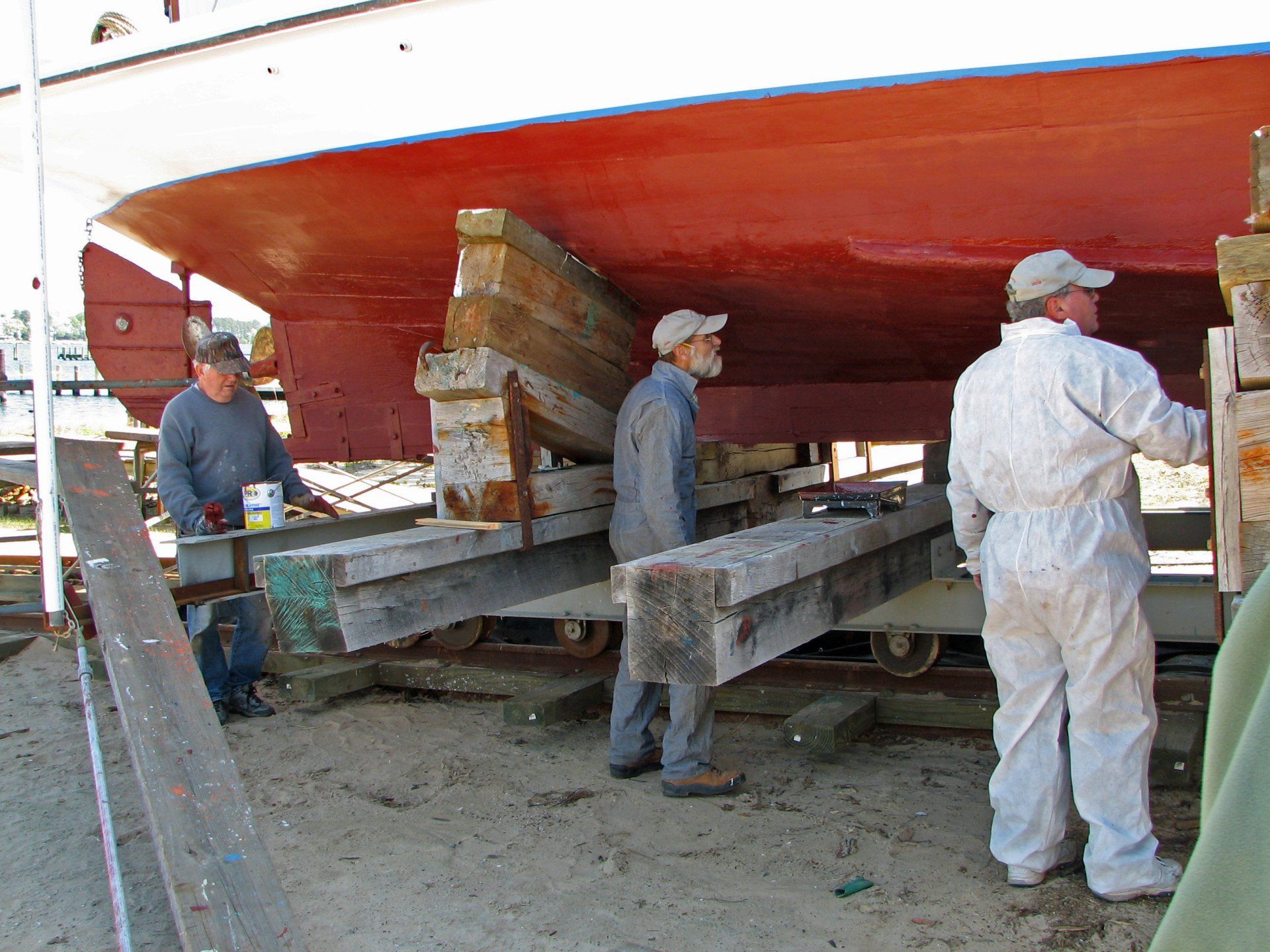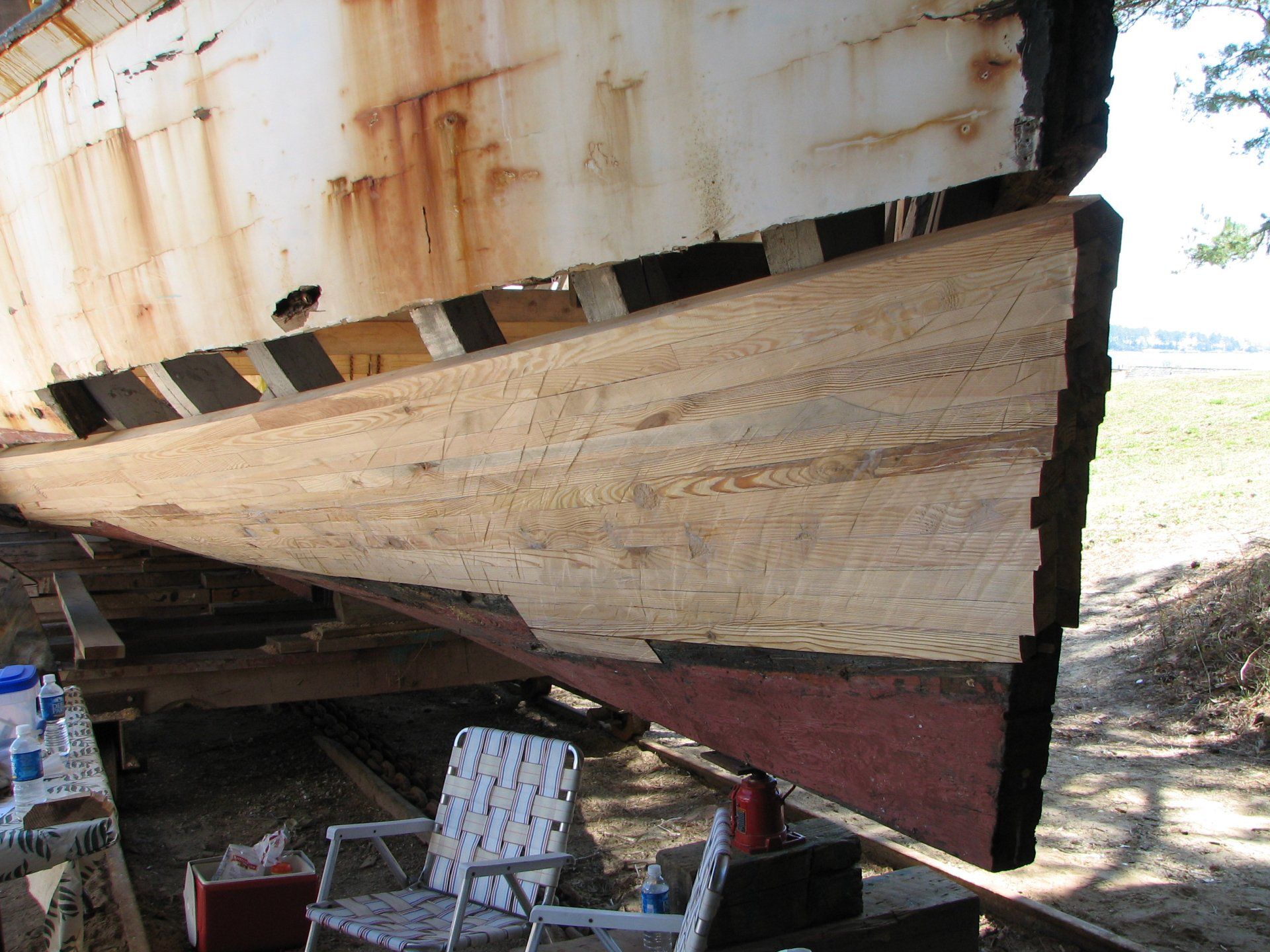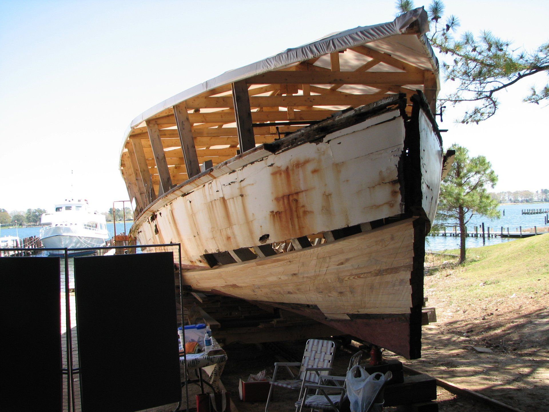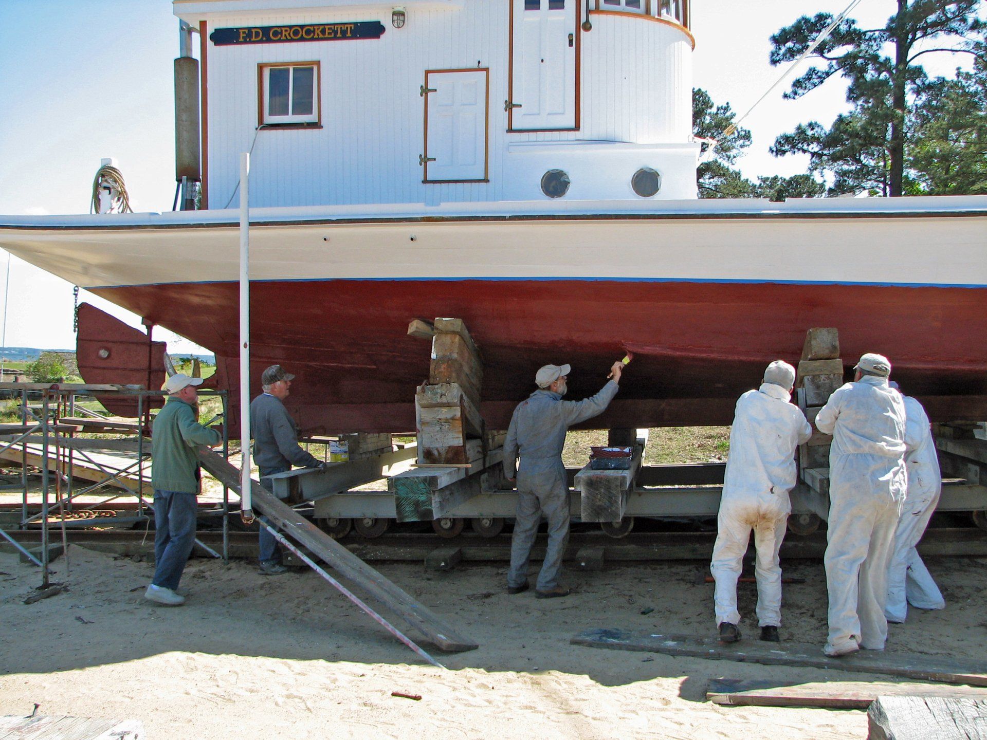 Since her arrival at the Deltaville Maritime Museum as a beautiful but decaying hull in September of 2005, over 8500 hours of volunteer labor have gone into restoring the F.D. Crockett. Because the Crockett was continually worked until the 1990s, the logs, the longest of which is 55 feet, were still in excellent condition. However, her decks and pilot house started crumbling and her sides deteriorated once she was no longer an active workboat.